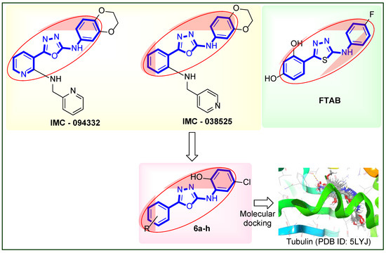 The oxadiazole-linked aryl core (represented as bold blue bond) of IMC-038525 (tubulin inhibitor; IC50 = 0.39 ± 0.06 μM), IMC-094332 (tubulin inhibitor), and FABT (anticancer; ID50 = 6.2 ± 1.4 (HCV29T), 3.9 ± 1.1 (SW707) and 4.2 ± 1.2 (T47D) µg/mL, respectively) was used in the design strategy for the newer oxadiazole analogues shown in Figure 2 [27,28,29]. Similarly, FTAB is another anticancer compound, whose 1,3,4-thiadiazole ring was replaced with an isostere 1,3,4-oxadiazole in the title compounds (6a-h). Microtubules are highly dynamic structures made up of α- and β-tubulin heterodimers that are indispensable for cell division (mitosis) and growth [30]. The expression of specific tubulin isotypes has been linked to cancer, but the exact mechanism is still unknown. Many tubulin-binding chemotherapeutics target the tubulin family protein to suppress the dynamics of the mitotic spindle to cause mitotic arrest and cell death [31]. Because the synthesized compounds have the same pharmacophoric core as the tubulin inhibitors IMC-038525 and IMC-094332, they can be used as tubulin inhibitors. As a result, a putative mechanism of action of the target compounds (6a-h) as anticancer agents was discovered using a molecular docking approach.