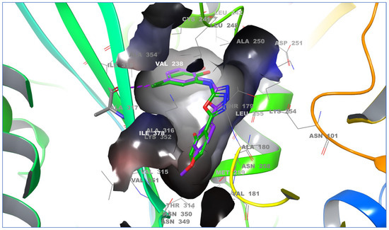 Three-dimensional binding interaction of ligands 6d (violet) and 6f (green)with the active site of tubulin–combretastatin A4 (PDB ID: 5LYJ).