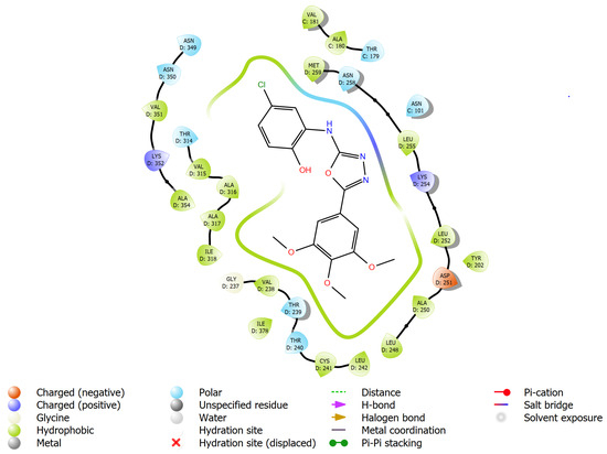 Some of the oxadiazole analogues displayed good anticancer activity against some of the cancer cell lines and the compounds were also designed based on the pharmacophore of tubulin inhibitors, hence a molecular docking study of tubulin was explored against the active site of tubulin–combretastatin A4 (PDB ID: 5LYJ). The molecular docking scores and interactions are given in Table 4. The molecular docking score of the ligands (6a-h) ranged from −7.617 to −8.389 kcal/mol and they displayed two types of interactions, including H-bonding and halogen bonding. Ligand 6d displayed maximum binding affinity with a docking score of −8.389 kcal/mol and exhibited a halogen bond interaction with the residue Ala317, while ligand 6e displayed a docking score of −7.617 kcal/mol with no significant interaction. Ligands 6d and 6f displayed a similar type of interaction with the residue Ala317 through a halogen bond interaction. The 2D and 3D interactions of ligands 6d and 6f are shown in Figure 3 and Figure 4, respectively. Ligands 6a and 6b displayed a H-bond interaction with the residue Asn258, while they showed a halogen bond interaction with the residues Ala317 and Asn349, respectively. Ligand 6h displayed no significant electrostatic interaction; however, the trimethoxy phenyl ring lies with the hydrophobic cavity of containing residues Leu252, Ala250, Leu248, Leu242, Cys241, Val238, Ile318, Ala317, and Ala316, as shown in Figure 5.