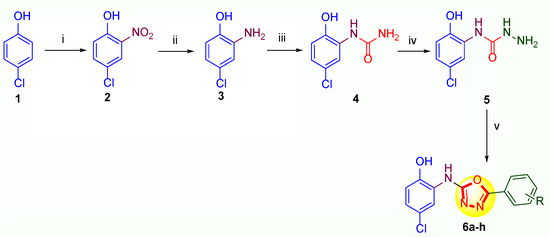 An equimolar mixture of N-(5-chloro-2-hydroxyphenyl)hydrazinecarboxamide (5) (1 mmol, 201 mg) and aromatic aldehyde (1 mmol) was dissolved in 5 mL ethanol, then 5 mL water was added and the reaction mixture was allowed to reflux at 100 °C for 8–10 h with an addition of 10% mol NaHSO3 (5 mL). The reaction mixture was then concentrated and poured into the crushed ice, filtered, dried, and recrystallized with ethanol to obtain the final product, 4-chloro-2-((5-aryl-1,3,4-oxadiazol-2-yl)amino)phenol analogues (6a-h) [36].