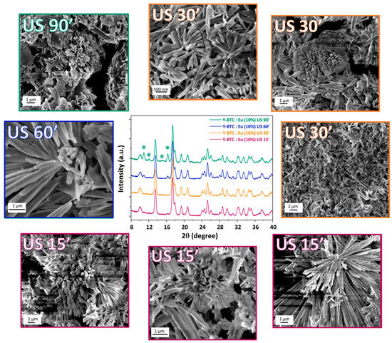 For each synthesis of Y-MOFs and Y,Eu-MOFs, structural characterisations have been carried out concurrently through XRD and FE-SEM in order to ascertain if potential alterations or MOFs morphology changes are closely associated with their crystal structure. An overview of SEM images and XRD patterns for MOFs of Y-BTC:Eu (10%) made by ultrasonic-assisted synthesis is shown in Figure 1. The PXRD patterns of all Y-BTC:Eu (10%) syntheses are comparable. Specifically, for Y-BTC: Eu (10%) synthesised under ultrasound conditions for 15 (sample US 15′, reddish line) and 30 (sample US 30′, orange line) minutes, the crystal structures are consistent with the one described in ref. [63], which is coherent with the crystalline phase Y(BTC)(H2O)6. Figure S1 reports a comparison of the Y-BTC: Eu (10%) US 15′ with the Y(BTC)(H2O)6 (GOCYAY) structure [63]. This result finds a counterpart in the product observed in the green synthesis of Y-BTC MOFs at room temperature and atmospheric pressure in a water/ethanol solution [49]. Nonetheless, as the reaction time increases, peaks suggest the presence of a second phase that starts to develop alongside the main crystalline phase, e.g., see the Y-BTC:Eu (10%) US 60’ (blue line) and US 90’ (green line). This minority phase may be connected to a novel crystal structure recently described, different from all the other known structures, which consists of Y3+/BTC3− units and a very small amount of water, [Y(BTC)]3H2O. Such structure was produced by employing a synthesis under reflux that took place in a water/ethanol solution for 24 h at a temperature of 80 °C [49].