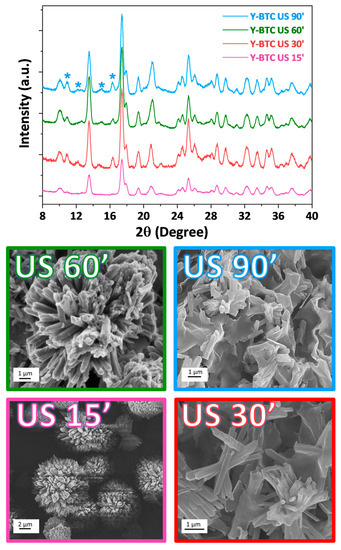 Figure 2. XRD patterns and FE-SEM images of Y-BTC samples synthetised under ultrasound for different reaction times: 15, 30, 60, and 90 min. * indicates peaks of a minority phase due to the novel crystal structure [Y(BTC)]3H2O [49].