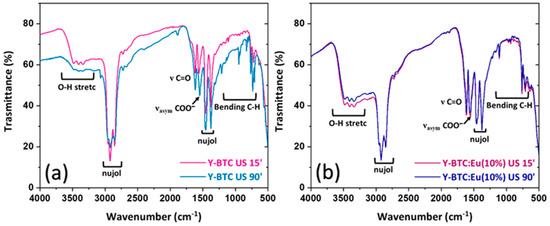 The FT-IR spectra of the Y-BTC and Y-BTC: Eu (10%) samples synthesised for 15 and 90 min provide additional support to the observations made by PXRD patterns. The FT-IR spectra of Y-BTC US 15’ and Y-BTC US 90’ are shown in Figure 3a. According to the degree and type of hydration in the two systems, these spectra demonstrate the existence of multiple peaks in the 3200–3500 cm−1 region, more pronounced for the US 15’ sample, associated with the -OH stretching. The nujol C–H stretching causes the signal at 2900 cm−1 to appear. Peaks at 1617 and 1560 cm−1 are related to the vibrations of the BTC ligand, and in particular to the stretching of the C=O and the asymmetric stretching of the COO-, respectively. The symmetric stretching of the COO-, usually observed around 1400 cm−1, is buried under the peaks due to the nujol oil at 1458 and 1375 cm−1.