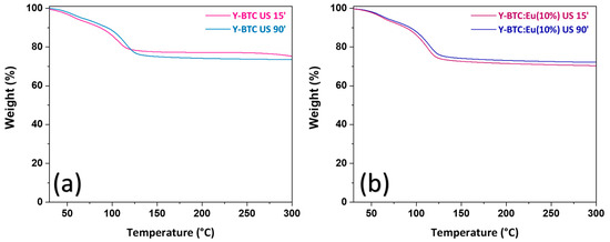 Figure 4. TGA curves of (a) Y-BTC US 15′ and Y-BTC US 90′; (b) Y-BTC: Eu (10%) US 15′ and Y-BTC: Eu (10%) US 90′.