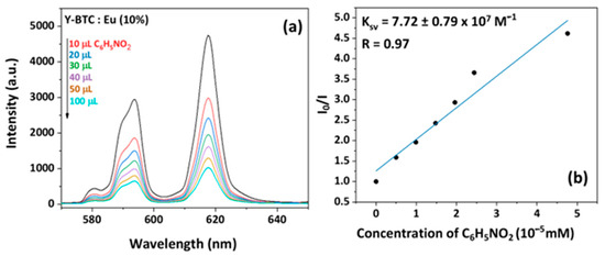 Aqueous solutions have been used to disperse the as-prepared Y-BTC:Eu MOF US 90’ (1 mg in 2 mL of H2O), and different quantities of C6H5NO2 (10−6 M solution in H2O) have been added to the suspension. To guarantee equal distribution and avoid sedimentation effects, the suspension has been sonicated for five minutes after each addition to produce suspensions suitable for luminescent measurements. The choice of a 5 min period of sonication allowed for the best possible interaction between the MOF and the identified species. Figure 6a illustrates a pronounced quenching effect on both the 5D0   7F1 and 5D0   7F2 peak intensities of the Eu3+ emission, which becomes evident even after the addition of just 10 μL of NB contaminant. To quantitatively assess this phenomenon, the Stern–Volmer (SV) equation I0/I = 1 + Ksv[M] [65] has been employed. The I0 and I represent the intensity values of the most intense peaks (617.5 nm) of the Y-BTC: Eu spectrum in the absence and presence of analytes, respectively. Ksv is the quenching constant, and [M] denotes the absolute concentration of the analyte. The linear coefficients R, close to one, reveal strong linear correlations and a good fit for the Stern–Volmer equation model.