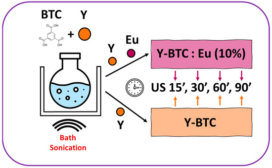 The syntheses were conducted under ultrasound at room temperature and atmospheric pressure for various reaction times according to the following reactions for Y-BTC (Equation (1)) and for Y-BTC:Eu (Equation (2)) and as reported in Scheme 1: