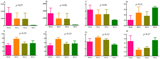 Coffee has great microbiological diversity [1]. The sequences of bacteria and fungi ranged from 40,037 to 81,509 and from 38,944 to 179,398, respectively, with average lengths of 376 bp for bacteria and 241 bp for fungi. The coverage of coffee samples in each group was higher than 0.99. At the operational-taxonomic-unit (OTU) level, the ace index had p-values of 0.07 and 0.35 in bacteria and fungi, respectively (Figure 1A,E). The p-values of the Chaol index were 0.08 in bacteria and 0.35 in fungi. Among bacteria, WC0 had the highest Chaol index (Figure 1B), while among fungi, the highest Chaol index was observed in WC1 (Figure 1F). These results indicated that WC0 and WC1 had the highest species richness in bacteria and fungi, respectively.