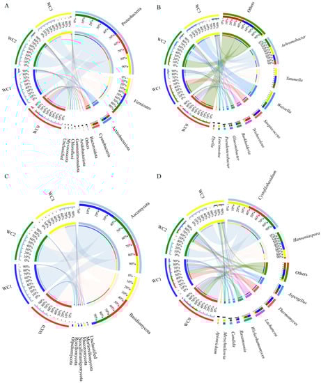 Microbial community structure in wash processing during the fermentation process. The percentage of community abundance on the phylum level of bacteria (A); the percentage of community abundance on the genus level of bacteria (B); the percentage of community abundance on the phylum level of fungi (C); the percentage of community abundance on genus level of fungi (D). Left: half circles mean the microbial community structure of different fermentation times, and different colors of left outer circles represent different coffee samples from fermentation times; among them, red represents WC0, blue represents WC1, green represents WC2, and yellow represents WC3, and the numbers represent the percentage of community abundance of different microorganism in these samples. Right: half circles mean the percentage of community abundance of different microorganisms on phylum or genus level, and different colors represent different microorganisms on phylum or genus level; the number represents the percentage of community abundance of these microorganisms in different samples.