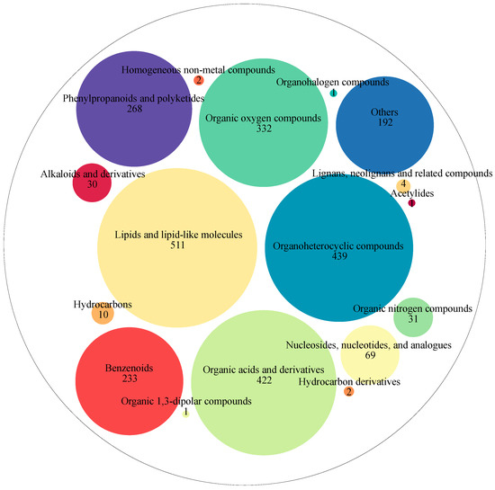 Then, these metabolites were further grouped into 154 classes. These classes mainly included carboxylic acids and derivatives (352 metabolites), organooxygen compounds (331 metabolites), fatty acyls (203 metabolites), prenol lipids (157 metabolites), benzene and substituted derivatives (128 metabolites), flavonoids (88 metabolites), steroids and steroid derivatives (84 metabolites), phenols (60 metabolites), indoles and derivatives (54 metabolites), glycerophospholipids (52 metabolites), cinnamic acids and derivatives (49 metabolites), pyridines and derivatives (45 metabolites), coumarins and derivatives (41 metabolites), benzopyrans (37 metabolites), organonitrogen compounds (31 metabolites), isoflavonoids (27 metabolites), keto acids and derivatives (27 metabolites), imidazopyrimidines (26 metabolites), quinolines and derivatives (25 metabolites), lactones (19 metabolites), purine nucleosides (19 metabolites), hydroxy acids and derivatives (18 metabolites), naphthalenes (17 metabolites), phenylpropanoic acids (17 metabolites), pyrans (16 metabolites), pyrimidine nucleoside (16 metabolites), dihydrofurans (15 metabolites), piperidines (15 metabolites), peptidomimetics (13 metabolites), azoles (12 metabolites), diazines (12 metabolites), glycerolipids (10 metabolites), heteroaromatic compounds (10 metabolites), pyrrolidines (10 metabolites), and others.