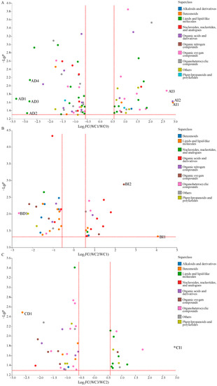 The DCMs between WC1 and WC0 (A), AI1: 3,4-dihydroxymandelic acid, AI2: portulacaxanthin II, AI3: mycophenolic acid O-acyl-glucuronide (FC > 5.0); AD1: BULLEYACONITINE A, AD2: PS(15:0/24:1(15Z)), AD3: PC(18:2(9Z,12Z)/18:1(11Z)), AD4: PC(14:1(9Z)/20:1(11Z)) (FC < 0.20); DCMs between WC2 and WC1 (B), BI1:stanozolol, BI2: 2-deoxy-D-ribose(FC > 5.0), BD1: cantharidin (FC < 0.20); DCMs between WC3 and WC2 (C), CI1: L-quinate (FC > 5.0), CD1: bisnoryangonin (FC < 0.20).