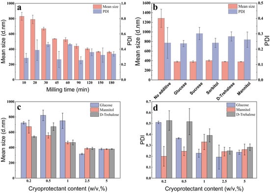 The effect of the milling time and cryoprotectant on the characteristics of the nanosuspension: (a) milling time, (b) category of cryoprotectant, (c) content of cryoprotectant, and (d) PDI.