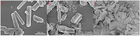 Scanning electron microscopy revealed the morphologies of the three fluopyram solid formulations. The FLU-NS particles exhibited a regular rod-like shape, smooth surface, uniform size, and monodispersity, as shown in Figure 4a. In contrast, the FLU-MS and FLU-WP particles had rough and uneven surfaces. The presence of a large amount of diatomaceous earth made it challenging to observe the morphology of FLU-WP, as shown in Figure 4c.