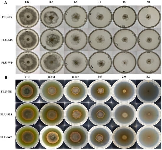 The antifungal activity of three fluopyram solid formulations against Botrytis cinerea (A) and Alternaria solani (B). The mycelium growth inhibition method was used to test the FLU activity and determine the EC50 calculated using IBM SPSS Statistics Version 26.0.