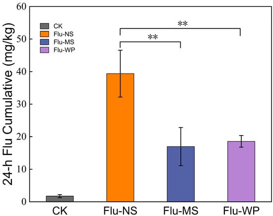 To gain insight into the mechanisms underlying the differences in the antifungal activity of formulations with varying particle sizes, fluopyram uptake tests were employed to measure the intracellular accumulation of these formulations. The cells in each test were starved via exposure to a glucose-depleted medium prior to FLU incubation, thus exhausting the cellular ATP. The incubation of FLU was then conducted under glucose-depleted conditions, to maximize the pesticide uptake, with the elimination of the efflux behavior of B. cinerea. When compared to the FLU-MS and FLU-WP group, FLU-NS extremely significantly improved the mycelial-ball uptake of FLU at 24 h (p < 0.01) (Figure 8).