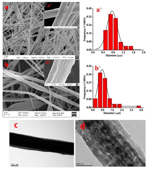 Characterization of electrospinning nanofibers by SEM (a,a″,b,b″), in addition the ruler length of the SEM (a″,b″) is 200 nm, TEM (c,d), and the size distributions of nanofibers (a′,b′). (a,c) 10% (w/v) PS single nanofibers; (b,d) 10% PS-10% HMWCNTs (w/v) composite nanofibers.