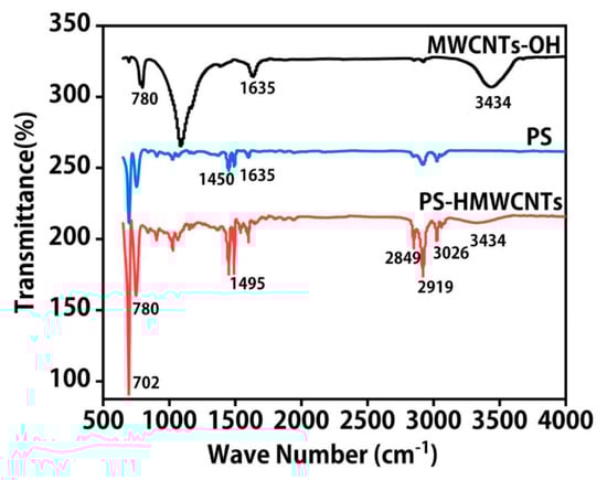 The Fourier-transform infrared (FTIR) spectra of the PS and PS-MWNCTs-OH nanofibers are shown in Figure 2. The peaks at 694 cm−1 and 752 cm−1 were assigned to the C–H vibrational absorption peaks of the PS benzene ring. However, the peaks at 1026 cm−1 and 1450 cm−1 were attributed to the C–H bending and C–H deformation vibrations, respectively. Both peaks at 1492 cm−1 and 1600 cm−1 were due to the C=C double-bond stretching vibration peaks. The absorption peaks at 2849 cm−1, 2918 cm−1, and 3024 cm−1 were caused by the C–H stretching vibrations. At 1220 cm−1, there was a strong absorption peak, which was caused by the C–C stretching vibration of the main structure of the carbon nanotube. The strong absorption peak at 1635 cm−1 was assigned to the C=C stretching vibration of the multi-walled carbon nanotube. The characteristic peak of the hydrophilic group appeared in the infrared spectrum of MWNCTs-OH, and the broad and strong peak at 3434 cm−1 was the O–H stretching vibration peak of the hydroxyl group, which fully demonstrated the successful hydroxylation modification of carbon nanotubes. There were no new absorption peaks on the infrared spectrum of PS-MWNCTs-OH, indicating that no new chemical bonds were formed.