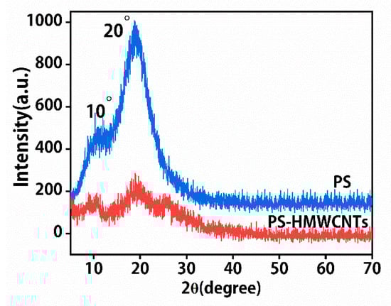 Figure 3 demonstrates the X-ray diffraction analysis of PS nanofibers and PS-HMWCNT composite nanofibers. As shown in Figure 3, the PS nanofibers’ characteristic diffraction peaks were 2θ = 11° and 18°, respectively. The XRD characteristic diffraction peaks of PS-HMWCNT nanofibers were similar to the PS nanofibers, at 2θ = 10° and 20°. In addition, the PS-HMWCNT composite nanofibers’ overall crystallinity was lower than that of PS because the peak intensities of the PS-HMWCNT composite nanofibers at 2θ = 10° and 20° were lower. The above results indicate that pure MWNCTs-OH and PS particles were thoroughly mixed and that strong molecular interactions were generated between them.