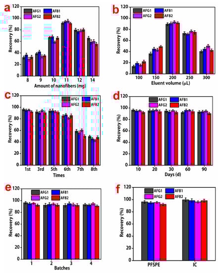 Four batches of PS-MWCNTs-OH nanofibers prepared at different times were used to investigate the effect of different batches of nanofiber materials on the elution rates of the four aflatoxins. Figure 4 depicts that, through the adsorption of nanofibers prepared at different times, the elution rates of the target substance were almost the same. The results illustrated that the quality of PS-HMWCNT nanofibers prepared in different batches maintained good consistency and stability.