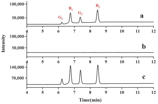 In order to calibrate and verify the developed method, one kind of milk sample with free aflatoxins, as reported before, was detected by the National Standard Method [24] and then treated as a blank sample. Repeatability, linearity, limit of detection (LOD), and LOQ were obtained by the optimized conditions. As shown in Table 1, good linearity was found in the range of 0.5–20.0 ng mL−1 for AFTB, 0.5–20.0 ng mL−1 for AFTG2, 0.2–10 ng mL−1 for AFTB2, and 0.5–40 ng mL−1 for AFTG1. The LODs and LOQs of AFTB1, AFTG2, AFTB2, AFTG1 ranged from 0.07–0.16 ng mL−1 to 0.23–0.53 ng mL−1, respectively. The low, medium, and high concentrations of 0.05, 0.5, and 5 ng/mL were added into the blank milk as the spiked samples detected by the new established method and calculated to get intra-day and inter-day precisions. Hence, the intra-day RSD was 2.81–6.43% and the inter-day RSD was 3.42–7.75%. The recoveries of the four aflatoxins in different concentrations ranged from 80.22% to 96.21%. Generally, the above results indicated that this method is appropriate for detecting aflatoxins in milk samples.