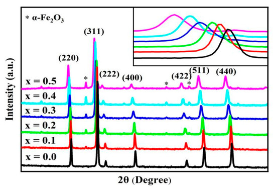 Figure 1 illustrates the XRD patterns of the spinel ferrite system CdxNi0.5−xCu0.2Zn0.3Fe2O4 (0 ≤ x ≤ 0.50, in steps of 0.10). The Miller index (hkl) of the spinel phase is marked in the figure, corresponding to the (220), (311), (222), (400), (422), (511), and (400) crystal planes. The XRD patterns were analyzed using Jade 5 software, revealing the formation of a cubic spinite structure with space group Fd-3m, which was in accordance with the JCPDS standard card number 74-0748. Moreover, we observed a second phase apart from the sample (x = 0). The second phase was a peak of the hematite hexagonal phase α-Fe2O3 (JCPDS # 86-0550), with space group R-3c and lattice parameters a = b = 5.03 Å and c = 13.73 Å. M. H. Nasr et al. used Ni-doped Fe–Cd spinel nanoferrite [8], which also produced the secondary phase -Fe2O3 as the Ni doping increased. Vivek Verma et al. [9] synthesized Li0.35Cd0.3Fe2.35O4 lithium–cadmium ferrite with secondary-phase α-Fe2O3 generation using a hybridized citrate gel precursor technique in a different pH medium. Munish Gupta et al. [14] prepared cadmium ferrite (CdLixFe(2−x)O(4−x)); 0 ≤ x ≤ 0.50) using ammonium hydroxide as a co-precipitant, and also observed the presence of Fe2O3. This result shows that the solid solution limit of Cd-doped Ni–Cu–Zn spinel ferrite is less than x = 0.1. XRD patterns can be derived for the lattice constant (a), grain size (D), and X-ray density (ρx).