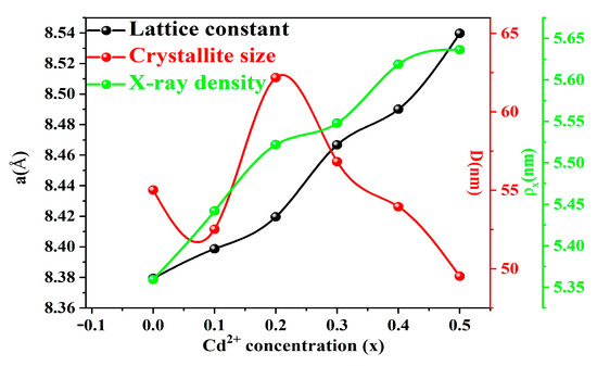 Variation of the sample lattice constant, grain size, and X-ray density according to the amount of Cd2+ doping.
