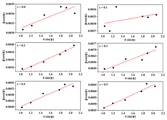 Williamson–Hall plot of CdxNi0.5−xCu0.2Zn0.3Fe2O4 (0 ≤ x ≤ 0.50, in steps of 0.10).