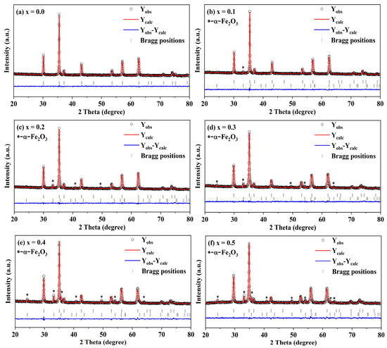 The XRD of the spinel ferrite system CdxNi0.5−xCu0.2Zn0.3Fe2O4 (0 ≤ x ≤ 0.50, in steps of 0.10) was subjected to Rietveld refinement in order to further investigate the crystal structure of the samples, as shown in Figure 4.The refinement results indicate that samples have an Fd-3m space group with increasing lattice constants and an increasing trend in the volume fraction of α-Fe2O3. The lattice constants of the samples obtained after the Rietveld refinement are very similar to those obtained by the XRD fit. The ionic radii of the doped ions can account for the increase in lattice constant with increased Cd concentration. Moreover, the significant difference in ionic radii between Cd2+ (0.97 Å) and Ni2+ (0.69 Å) may be the primary cause of this phenomenon. The R-factor, refinement parameters, and goodness-of-fit are reported in Table 2. Harpreet Kaur et al. [7] used Zn2+ and Cd2+-doped cobalt ferrite, and the experimental results found that the lattice constant of the sample becomes larger after doping. The explanation is that the ionic radii of Zn2+ (0.74 Å) and Cd2+ (0.97 Å) are larger than that of Co2+ (0.70 Å), which is in agreement with experimental results of the present work. M. H. Nasr et al. [8] employed Ni2+-doped cadmium ferrite and found that the lattice constant keeps getting smaller with increasing Ni content. This experimental result is corroborated by our experimental results.