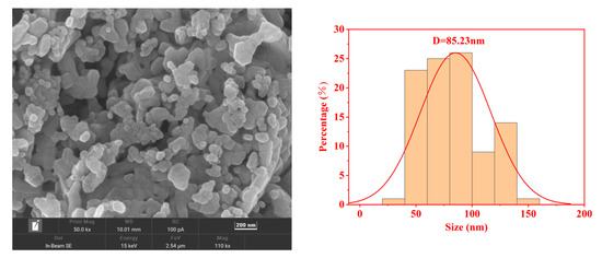 SEM tests were conducted on representative samples where x = 0.1 in order to examine the surface morphology of spinel-structured ferrite. Figure 5 indicates that the surface morphology of the sample where x = 0.1 is inhomogeneous, spherical, and highly agglomerated. The agglomeration phenomenon of the sample particles is a natural consequence of the sol–gel self-propagation method of synthesis [6]. The particle distribution of the samples was plotted. The mean particle size was determined by fitting the histogram of the particle distribution to a normal distribution function. The average grain size obtained statistically in SEM is approximately 85.23 nm, which is larger than the grain size estimated by the Williamson–Hall formula. This indicates that each nanoparticle in the synthesized sample consists of numerous microcrystals. Harpreet Kaur. et al. [7] prepared Cd-doped Co ferrite samples using the sol–gel method. In addition, the experimental results indicated that the particle size (DSEM) obtained by scanning electron microscopy statistics of the samples was 58.83 nm, and the microcrystal size (DW-H) estimated by the Williamson–Hall formula was 47.79 nm. This result is consistent with the results of the present work.