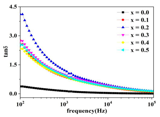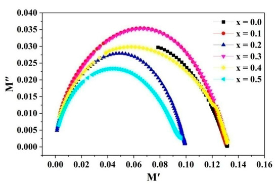 The sample’s Nyquist plot is shown in Figure 11. Evenly curving arcs can be observed in the figure (except for where x = 0.0). This indicates that grain boundaries occupy a larger volume and that grain boundaries dominate the conductive behavior [16]. By analyzing the complex modulus, it is possible to study materials with the same resistance but different capacitances. M.M. Hossen et al. [4,10] obtained dielectric experimental results using La and Mn -doped Ni–Cu–Cd ferrites, which are in agreement with our experimental results.