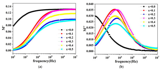 Figure 10a,b indicate the variation curves of the dielectric modulus real part and the dielectric modulus imaginary part with the external field frequency in the frequency range from 100 Hz to 100 KHz. When the frequency is below 103 Hz, the M′ value is close to zero, which is known as the low-frequency region. The M′ value increases continuously with the increase in frequency and reaches the highest point of saturation in the high-frequency region when the frequency is greater than 103 Hz. The spatial variation of the charge carriers (release of space-charge polarization) in the short-range region causes the saturation maxima of M′ in the high-frequency region during the conductivity process. Moreover, the minimum values result from the spatial variation of charge carriers in the long-range region during the conductivity process [4,10]. Figure 10b illustrates that the curve of M″ with frequency has a unique peak (except where x = 0.0). The peak changes to higher frequencies as the cadmium content increases. These peaks provide crucial information regarding the type of carrier migration within the system. The peak divides the frequency into two regions: low and high frequencies. In the low-frequency region, the carriers undergo long-range displacement, whereas in the high-frequency region, they experience short-range movement.
