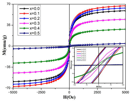 Figure 12 depicts the measured hysteresis lines of the spinel ferrite system CdxNi0.5−xCu0.2Zn0.3Fe2O4 (0 ≤ x ≤ 0.50, in steps of 0.10) at room temperature. The sample hysteresis line is S-shaped when x = 0.0–0.4, indicating that the sample is ferromagnetic. The hysteresis line of the x = 0.5 sample is close to a straight line, indicating that the sample is weakly ferromagnetic and close to being paramagnetic.