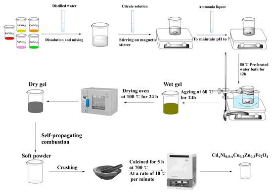 Process flow diagram of a Cd2+-doped Ni–Cu–Zn spinel ferrite sample.