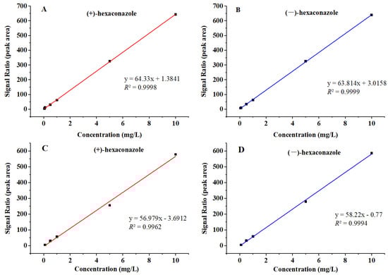 Calibration curves of (+)-hexaconazole and (−)-hexaconazole in hexaconazole solvent (A,B) and matrix-matched standards (C,D).