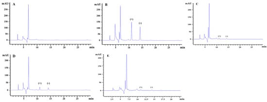 The EF values ranged between 0 and 1. The value of 0.5 indicates a racemic mixture, while EF > 0.5 or EF < 0.5 indicates preferential degradation of the (−)- or (+)-enantiomer, respectively [].