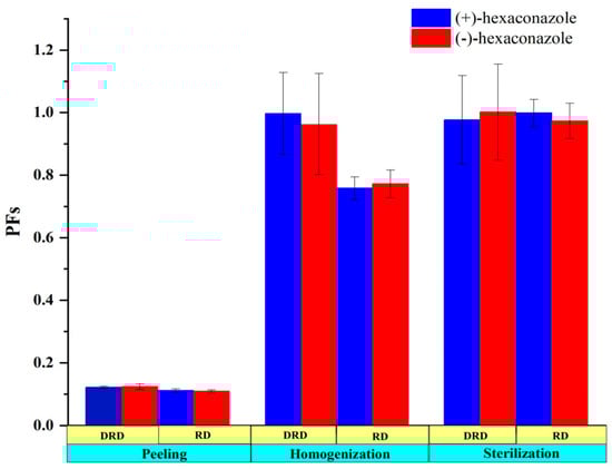Processing factors (PFs) of (+)- and (−)-hexaconazole during kiwifruit juice processing. DRD and RD refer to double recommended and recommended dosages, respectively.