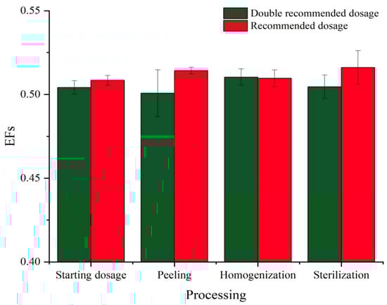 The enantioselectivity of hexaconazole during processing steps can be evaluated by EF values. As shown in Figure 5, the EFs of hexaconazole enantiomers after soaking, peeling, homogenization, and sterilization were 0.508, 0.514, 0.510, and 0.516 for the recommended dosage and 0.504, 0.500, 0.510, and 0.505 for double the recommended dosage, respectively. EFs of each processing were around 0.5, indicating similar degradation behavior of hexaconazole enantiomers during kiwifruit juice processing. These results were similar to a previous report, which suggested that there was no enantioselectivity of tetraconazole in the initial strawberry samples before fermentation in the process of wine-making []. However, the existence of yeast and microorganisms in strawberry juice contributed to the enantioselective process of the chiral compound. In addition, enzyme systems were supposed to play an important role in the enantioselective metabolism of many chiral pesticides, but that was on the condition of sufficient time for metabolism []. In the present study, however, healthy kiwifruits were selected with a small number of microorganisms and there were no extraneous ones introduced into the kiwifruit juice, together with the short exposure duration, so little enantioselectivity was observed during those procedures.