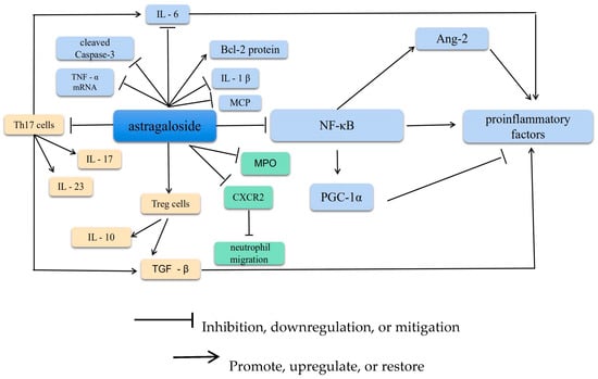 The inflammatory response is a key feature in the transition from mild to severe and critical illness. The inflammatory response is a reflection of the body’s defense against inflammatory factors. AS-IV exhibits anti-inflammatory effects and has been reported to reduce various types of inflammatory injuries, such as lipopolysaccharide (LPS)-induced organ damage, ischemia–reperfusion injury, allergic diseases, diabetes mellitus and its complications, myocardial injury, and hypertension []. These diseases are related to the downregulated gene expression of some inflammation-related factors. AS-IV involves activating transcription factors and downstream inflammatory cytokine release []. AS-IV exerts potent antagonistic effects on inflammation via multiple pathways. For example, AS-IV counteracts inflammatory damage by regulating inflammatory factors (interleukin [IL]-1β, tumor necrosis factor [TNF]-α, intercellular adhesion molecule [ICAM], and chemokines), inflammatory mediators (nitrogen oxide [NO]), the nuclear factor kappa-light-chain enhancer of activated B cells (NF-κB) signaling pathway, and apoptosis-related genes. Here, the mechanism of the anti-inflammatory effect of AS-IV has been described and is also depicted in Figure 2.