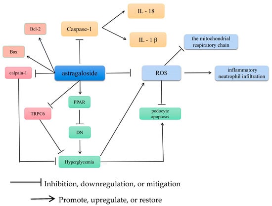 An in vitro study has shown that AS-IV inhibits damage to podocytes owing to high glucose-associated oxidative stress in a dose-dependent manner and reduces the expression of ILK []. The antioxidative effect of AS-IV may help protect podocytes by downregulating the expression of ILK []. Hence, AS-IV can effectively lower blood glucose levels, reduce urinary albumin excretion, and improve podocyte adhesive function, thereby delaying the progression of DN.