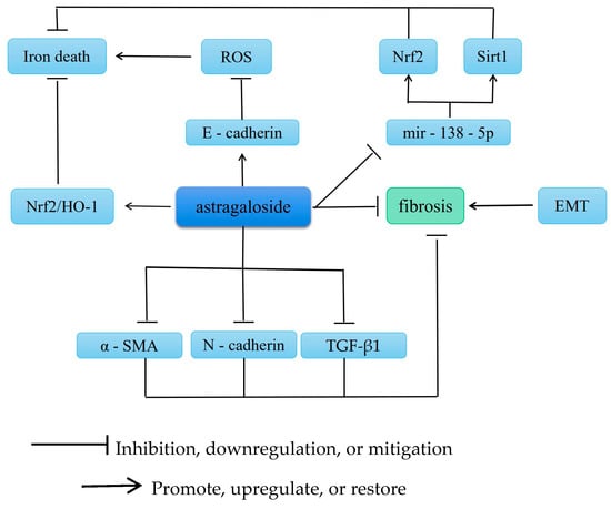 Iron death is an inevitable pathological change in end-stage renal disease and is involved in the development of renal fibrosis caused by various diseases. In particular, iron death is a novel form of iron-dependent, nonapoptosis-regulated cell death mainly caused by the reduced biological activity of glutathione peroxidase 4 either because of lipid peroxidation or ROS accumulation []. AS-IV prevents iron death in subarachnoid hemorrhage by activating the Nrf2/HO-1 pathway []. In a high glucose-induced mouse model, AS-IV has been found to mitigate the effects of high glucose by increasing mir-138-5p expression in retinal pigment epithelial cells and promoting Sirt1 and Nrf2 expression in the nucleus. In addition, AS-IV has been shown to inhibit miR-138-5p expression and enhance Sirt1/Nrf2 activity and cellular antioxidant capacity to mitigate the increase in iron []. Epithelial–mesenchymal transition (EMT) is a key process and a direct outcome of renal fibrosis []. A study has reported that EMT is associated with decreased epithelial E-cadherin and increased α-smooth muscle actin (α-SMA) expression in mesenchymal cells []. In addition, Xu [] has demonstrated that AS-IV attenuates oxidative stress by inhibiting glycated albumin-induced EMT, alleviating α-SMA expression, and increasing E-cadherin expression in renal proximal tubular cells. Table 1 summarizes the target or pathway of AS-IV in renal fibrosis.