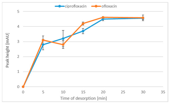 After the optimization of the adsorption time, we decided to check the relation between the extraction efficiency and the analyte desorption time. Therefore, desorption was conducted successively for: 5, 10, 15, 20 and 30 min. Each sample was prepared in triplicate. The results of the experiments are presented in Figure 4. It was found that the extraction yield increased up to the desorption time of 20 min. For longer desorption times, no changes in the height of analytical signals were noted. Therefore, in order not to extend the sample preparation procedure, we chose the MP analyte desorption time of 20 min.