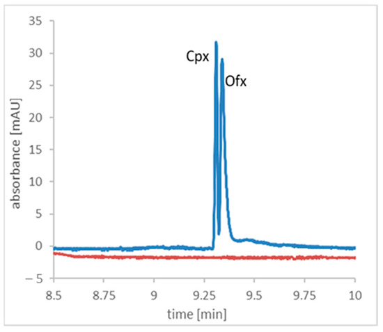 The validated method was utilized to analyze a real meat tissue samples. For this purpose, different types of meat tissues were analyzed. It was found that there is no matrix influence in what is shown in the representative electropherogram obtained after the analysis of the chicken liver tissue and spiked chicken liver tissue (Figure 5). This type of tissue was chosen because FQLs are cumulated in the liver. Figure 5 shows that the peaks are not well-separated to the baseline, but this was not the aim of the work. The main aim of the work was to develop an MP extraction procedure and optimize its parameters. The electrophoretic conditions were taken from our previous work [37]. In addition, the signals of Cpx and Ofx was recorded at two different wavelengths, which greatly facilitated the integration of the peaks. Nevertheless, the validation parameters are in accordance with the criteria, which nevertheless makes the method reliable.