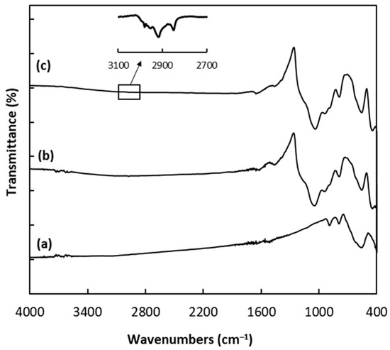 The FTIR spectra of the MPs at each stage of the synthesis were compared as shown in Figure 6. A characteristic band in the FTIR spectrum of MPs (Figure 6a) appears at 562 cm−1 and was assigned to the Fe–O–Fe vibration in magnetite nanoparticles [38,39]. After the modification of the magnetic nanoparticles with the silica coating, two adsorption bands with the maximum in 1038 cm−1 and 785 cm−1 were observed, resulting from the asymmetric and the symmetric stretching vibrations of Si–O–Si groups [38,39]. Moreover, the peak at ~930 cm−1 can be attributed to Si−OH stretching vibrations [38,39], while the band at 445 cm−1 can be associated with Si–O rocking vibrations [40]. In addition, the peak at ~1620 cm−1 comes from the O–H bending vibration of adsorbed water [38]. The introduction of C18 onto the surface of the silica coating resulted in the appearance of two bands (Figure 6c inset), which correspond to the asymmetric (2915 cm−1) and the symmetric (2847 cm−1) stretching vibration of methylene groups in the -(CH2)17CH3 chain [41]. Thus, the FTIR spectra confirm the modification of MPs with a silica coating and successful functionalization using C18.