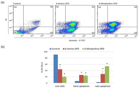 Induction of apoptosis in K562 cells treated with 6-Amino-SPD and 6-Morpholino-SPD at a concentration of 5 μM for 24 h. Data plots of control and treated cells (a) are divided into quadrants. Cells in Q1 are dead cells, Q2 cells are in late apoptosis, Q3 cells are in early apoptosis, and Q4 cells are live cells. The distribution of cells in each quadrant is shown graphically (b) in columns formed by the average percentage with standard deviations. (*) indicates a statistically significant difference compared with control (p < 0.05).