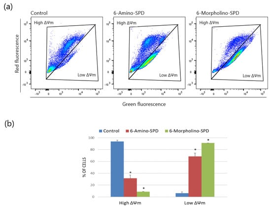 Mitochondrial membrane potential (ΔΨm) was measured in K562 cells treated with 5 μM 6-Amino-SPD and 6-Morpholino-SPD. Cells were seeded on 6-well plates at a concentration of 5 × 105 cells per well. After 24 h of incubation, the cells were collected and centrifuged at 600× g for 4 min at 4 °C. The supernatant was removed from the cells, and JC-1 staining solution prepared according to the manufacturer’s instructions (mitochondria staining kit for mitochondrial potential changes detection, Sigma-Aldrich, St. Louis, MO, USA) was added to the cells. At the end of the incubation, the JC-1 dye was removed from the cells by centrifugation at 600× g, 4 min at 4 °C, and washed with cold JC-1 buffer. Analysis was performed on a flow cytometer (FascCanto II, BD Bioscience, San Jose, CA, USA) using FlowJo software 10.7 (Flowjo LLC, Ashland, OR, USA).