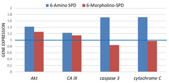 Expression of Akt, CA IX, caspase 3, and cytochrome c genes in K562 cells exposed to 6-Amino-SPD and 6-Morpholino-SPD at 2 μM in a period of 24 h. The expression results of the tested genes were normalized using the GAPDH gene. Expression in control cells is shown as a blue line.