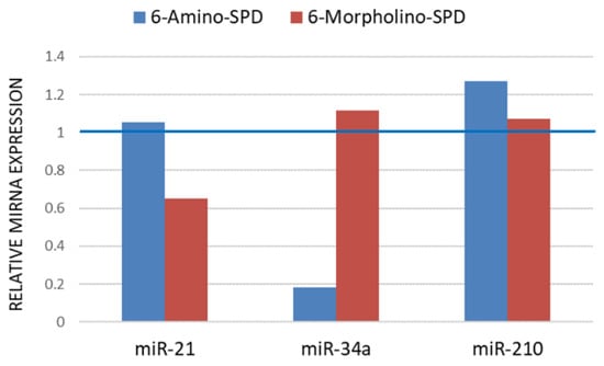 As shown in Figure 5, the effects of the derivatives used on the expression profiles of miR-34a and miR-210 are opposite. Treatment with 6-Amino-SPD resulted in a decrease in miR-34a expression, whereas 6-Morpholino-SPD resulted in a slight increase in miR-34a expression. On the other hand, the expression of miR-210 was increased after treatment with 6-Amino-SPD, whereas no significant changes were observed after treatment with 6-Morpholino-SPD, compared with control cells. Moreover, the expression of miR-21 in the leukemic cells remained unchanged after treatment with 6-Amino-SPD, in contrast to 6-Morpholino-SPD, which caused a decrease in expression. Overall, the tested derivatives showed opposite effects on the expression profiles of miR-34a, miR-210, and miR-21 (Figure 5).