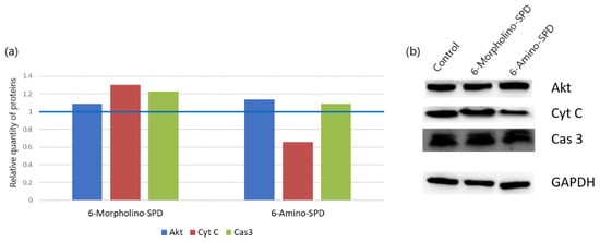 Western blot analysis of cytochrome c (Cyt c), caspase 3 (Cas 3), and Akt proteins in K562 cells treated with 6-Amino-SPD and 6-Morpholino-SPD at 2 μM for 24 h. Figure (a) shows the difference in expression after double normalization against GAPDH and control (expression of control shown as blue line). (b) Protein bands were separated by SDS-gel electrophoresis and visualized using chemiluminescent Immobilon Forte substrate. The ImageJ program was used to determine the density of the protein bands.