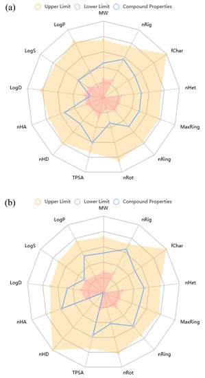 Physicochemical properties of compounds (a) 6-Amino-SPD and (b) 6-Morpholino-SPD. (MW, molecular weight; nRig, number of rings; fChar, formal charge; nHet, number of heteroatoms; MaxRing, number of atoms in the biggest ring; nRing, number of rigid bonds; nRot, number of rotatable bonds; TPSA, topological polar surface area; nHD, number of hydrogen bond donors; nHA, number of hydrogen bond acceptors; LogD, logarithm of the n-octanol/water distribution coefficients at pH = 7.4; LogS, logarithm of aqueous solubility value; LogP, logarithm of the n-octanol/water distribution coefficient).