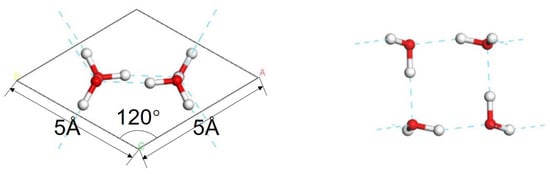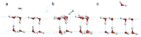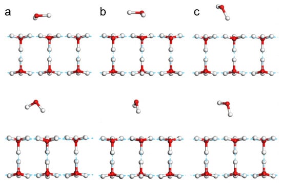 After optimization, the total energies of the three systems depicted in Figure 1a–c were −30,545.874 eV, −30,545.872 eV, and −30,545.882 eV, respectively. The upright configuration (Figure 1c) exhibited the lowest potential, and the system energy was −30,544.857 eV before optimization. Thus, the energy of the system was reduced by 1 eV. This shows that the monomer could not break the 2D ice structure to form new hydrogen bonds. Supplementary Material Video S1 shows the process of water molecules being repelled by 2D ice.