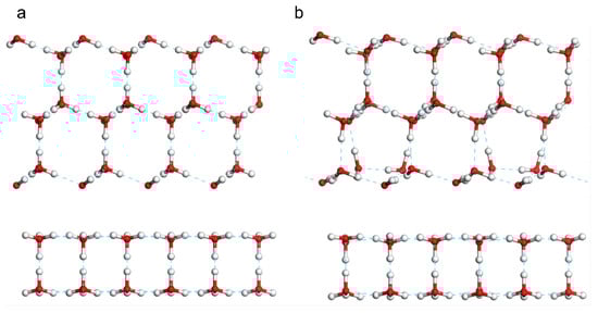 Given the large fluctuations in the electron densities, we used the GGA method for geometry optimization. According to our work on 3D ice phases, the revised PBE functional is the optimal exchange–correlation functional for phonon calculation [30,31,32,33,34,35]. The self-consistent field tolerance was set as eV/atom. Using an ultrasoft pseudopotential, the energy cut-off was set to 340 eV, and the k-point mesh was .
